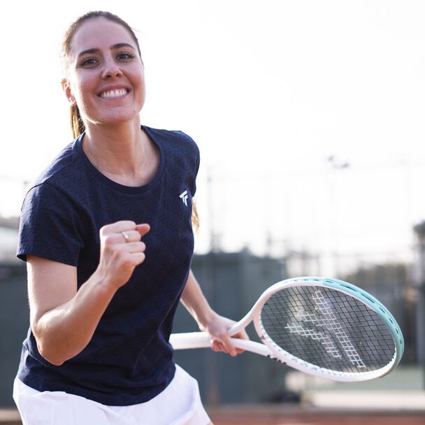 Її сучасний дизайн із ефектною графікою, натхненною логотипом Tecnifibre, залишаючись елегантним із використанням лише темно-синього та білого кольорів.